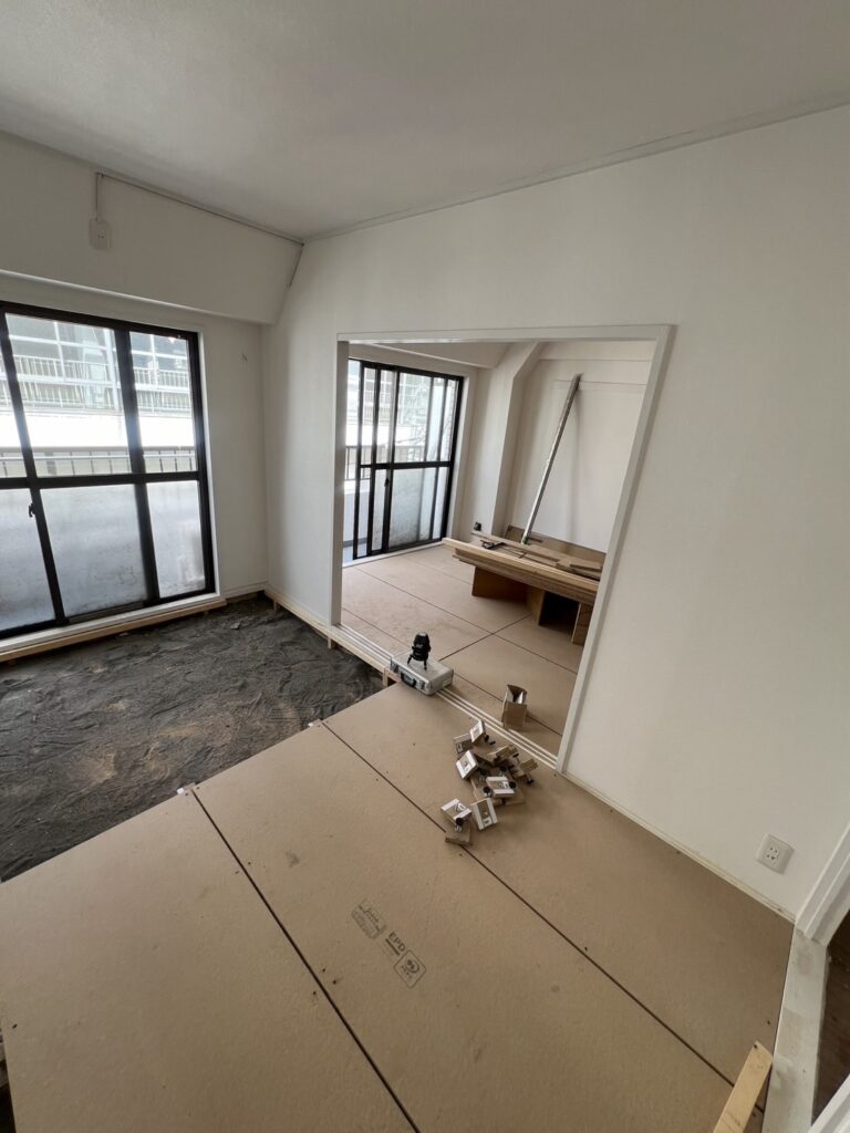 まず、既存の畳を撤去し、床を解体しました。その後、新しいフローリング材を施工するために、下地をしっかりと組んでいきます。