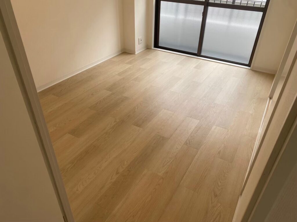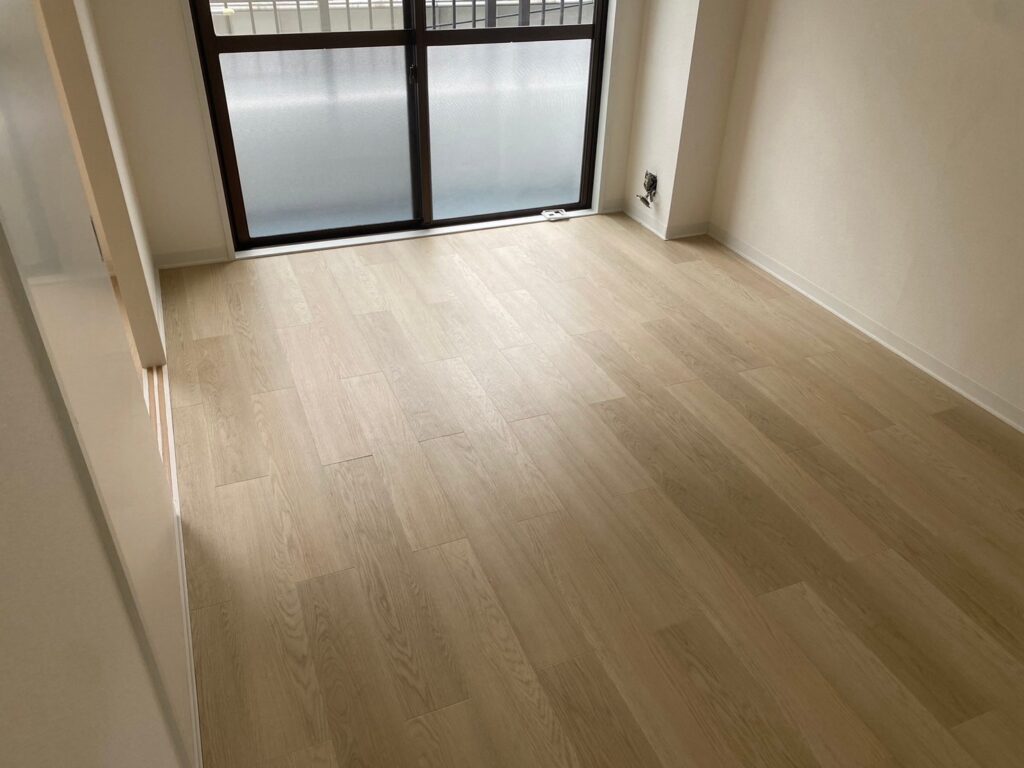 フロアタイルを貼り終えた洋室の完成後の様子です。ナチュラルな木目調のフロアタイルを選定したことで、空間が明るく、清潔感のある印象になりました。
