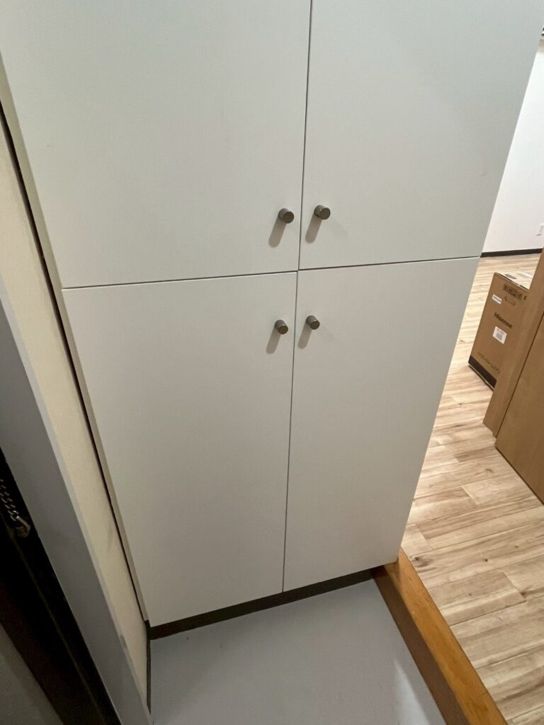 玄関のシューズボックスは、木目の経年劣化による色ムラが出ており、扉の角や取っ手まわりに細かなスレがありました。