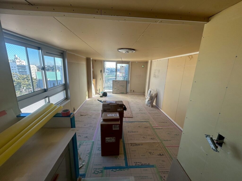 間仕切りや天井下地が組まれ、ボード張りまで完了した状態から仕上げ工程としてクロス施工に入ります。