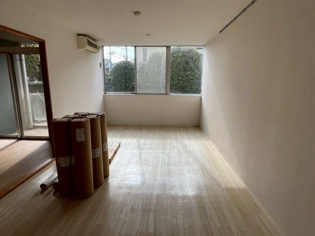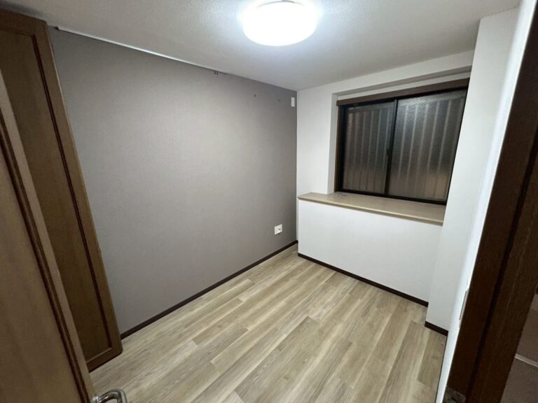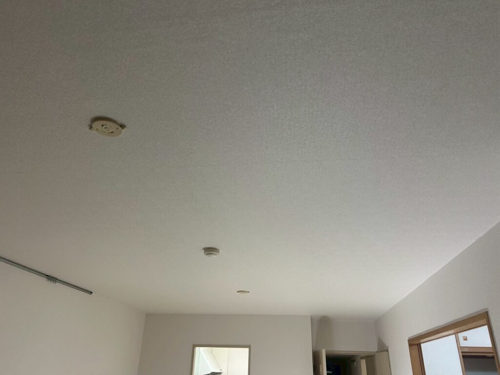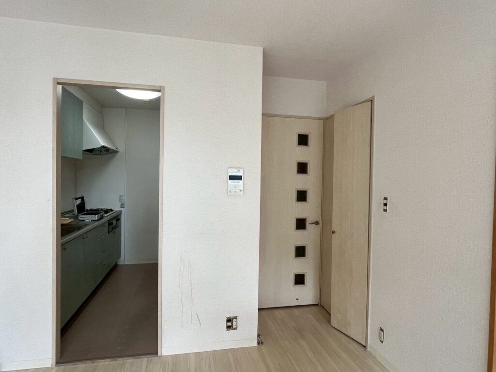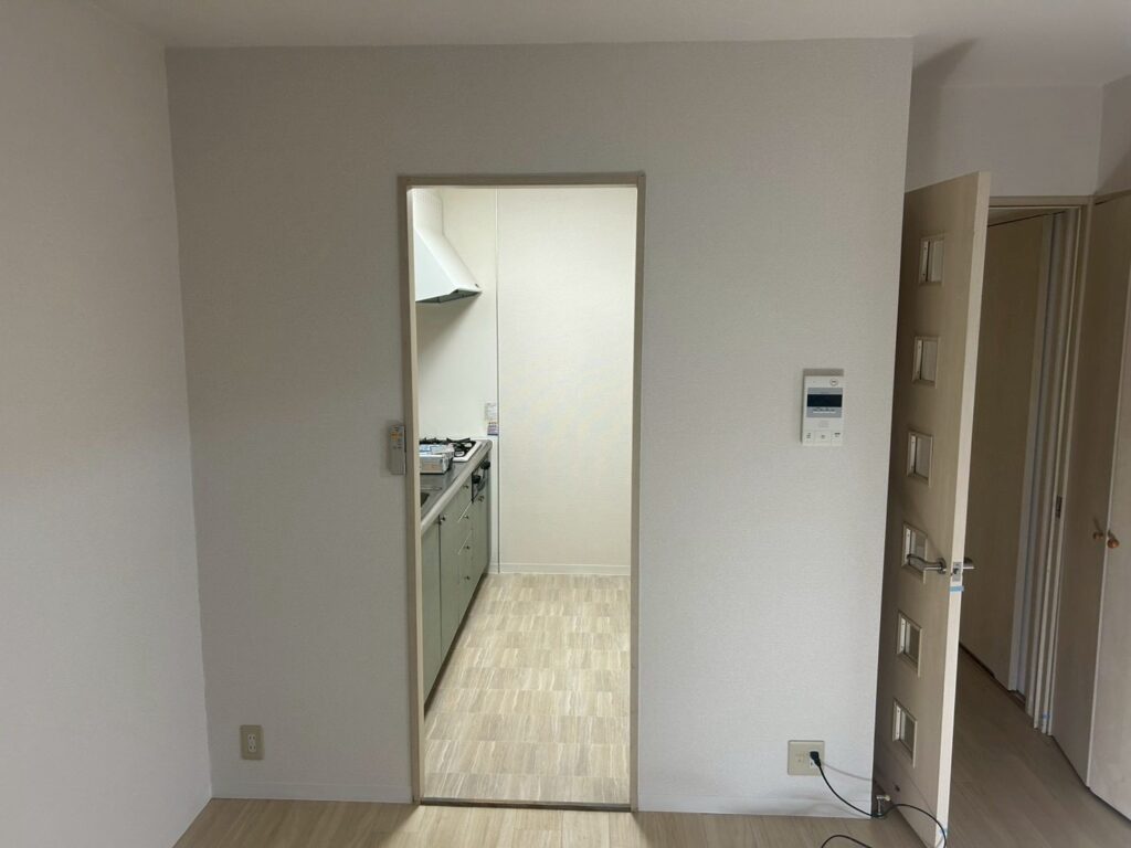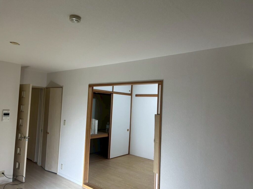 既存クロスを撤去後、下地処理を行い、不陸や傷を調整してから新規クロスを施工しました。